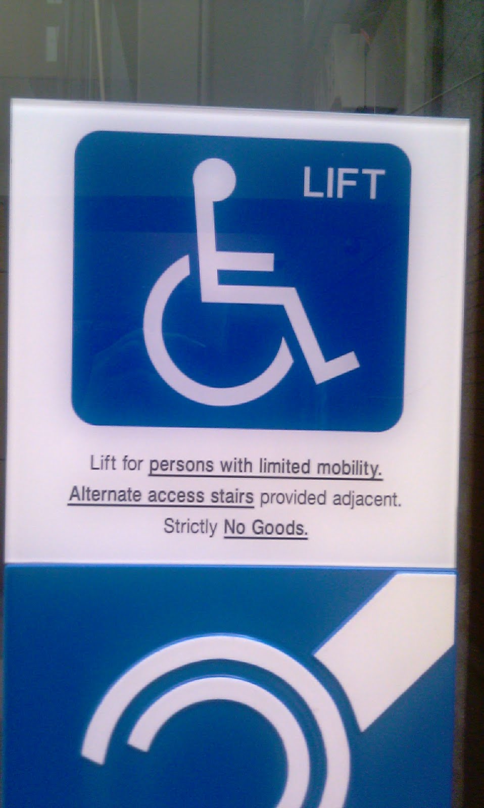 At this bus station exit, there are two choices: the lift, or a steep flight of stairs. Several times each week, I arrive at the bus station with a suitcase full of training materials. Does this make me a person with ‘limited mobility’? Does my suitcase qualify as ‘goods’? Am I, therefore, entitled to use this lift or not?